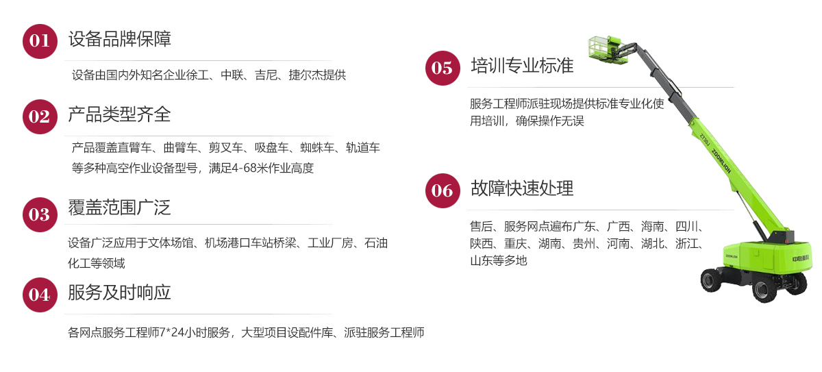 公司在發(fā)展歷程中堅(jiān)定實(shí)行大客戶戰(zhàn)略,致力于以優(yōu)質(zhì)的服務(wù)打造公司的品牌和核心競(jìng)爭(zhēng)力,現(xiàn)已在廣東、廣西、海南、四川、陜西、湖南、重慶、河南、湖北、貴州等多地建立了完善的售后服務(wù)網(wǎng)點(diǎn),24小時(shí)為客戶排憂解難。今后我們將結(jié)合市場(chǎng)需求,不斷創(chuàng)新業(yè)務(wù)模式、優(yōu)化設(shè)備結(jié)構(gòu)、加強(qiáng)運(yùn)營(yíng)管理、擴(kuò)大服務(wù)網(wǎng)點(diǎn)、提升服務(wù)水平,形成以設(shè)備租賃、銷售、二手設(shè)備交易等全方位一站式的全面服務(wù)體系,用高標(biāo)準(zhǔn)高質(zhì)量的服務(wù)讓客戶在和公司合作的過程中實(shí)實(shí)在在感受到省心、省力、省錢的體驗(yàn),在客戶心目中樹立“家鋒”的品牌形象。